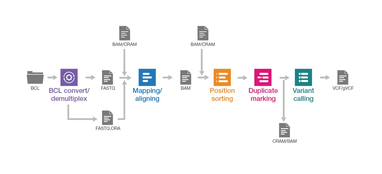 DRAGEN analysis provides the flexibility to insert a variety of input files and produce a range of output documents. Users can customize their experience and use and produce their desired file format. The actual steps vary for each pipeline.