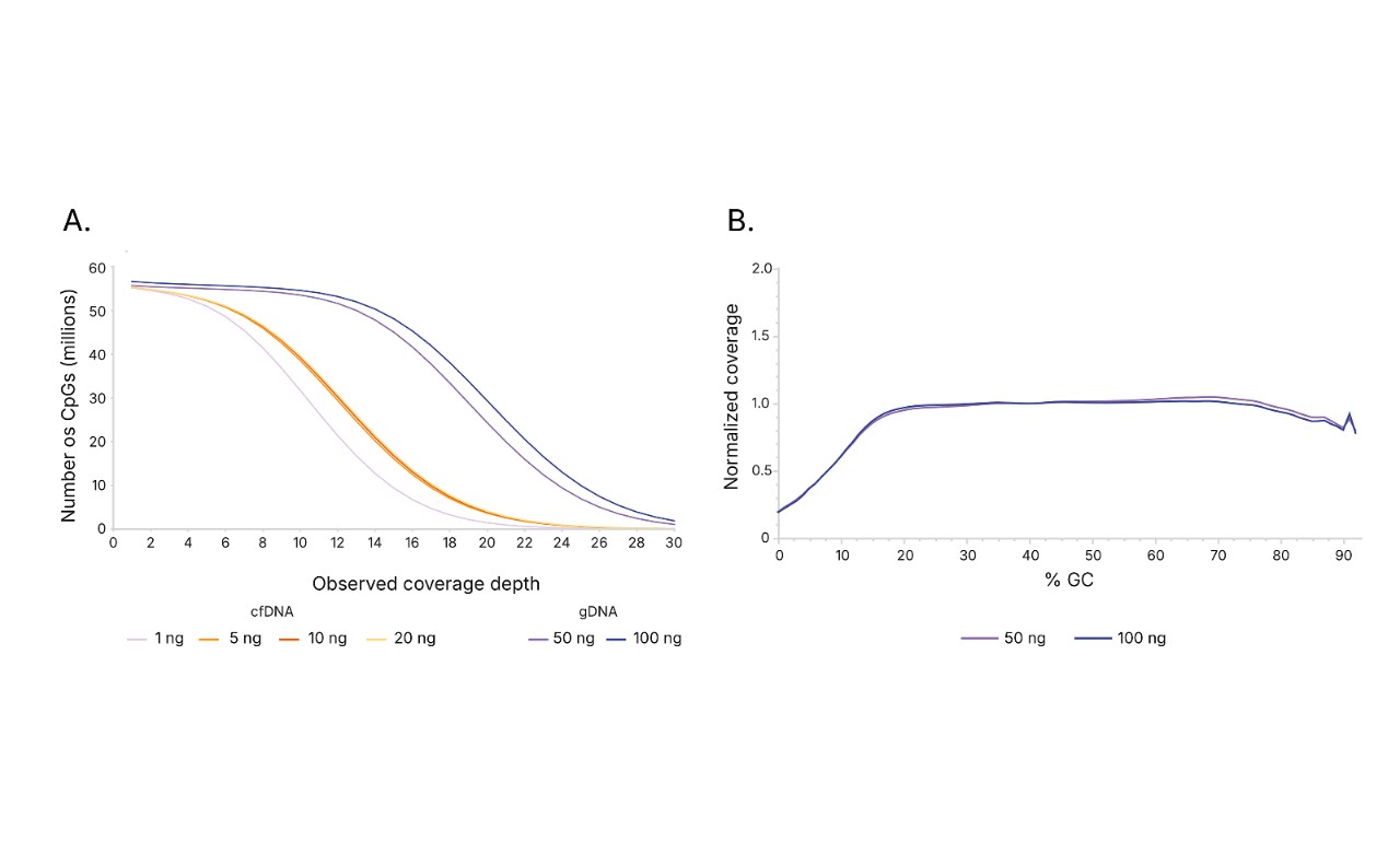 (A) High coverage of cytosine-guanine dinucleotides (CpGs) and (B) uniform coverage across a range of GC content using Illumina 5-Base DNA Prep. Input amounts are 1–20 ng cfDNA from healthy donors and 50–100 ng gDNA from human reference sample NA12878.