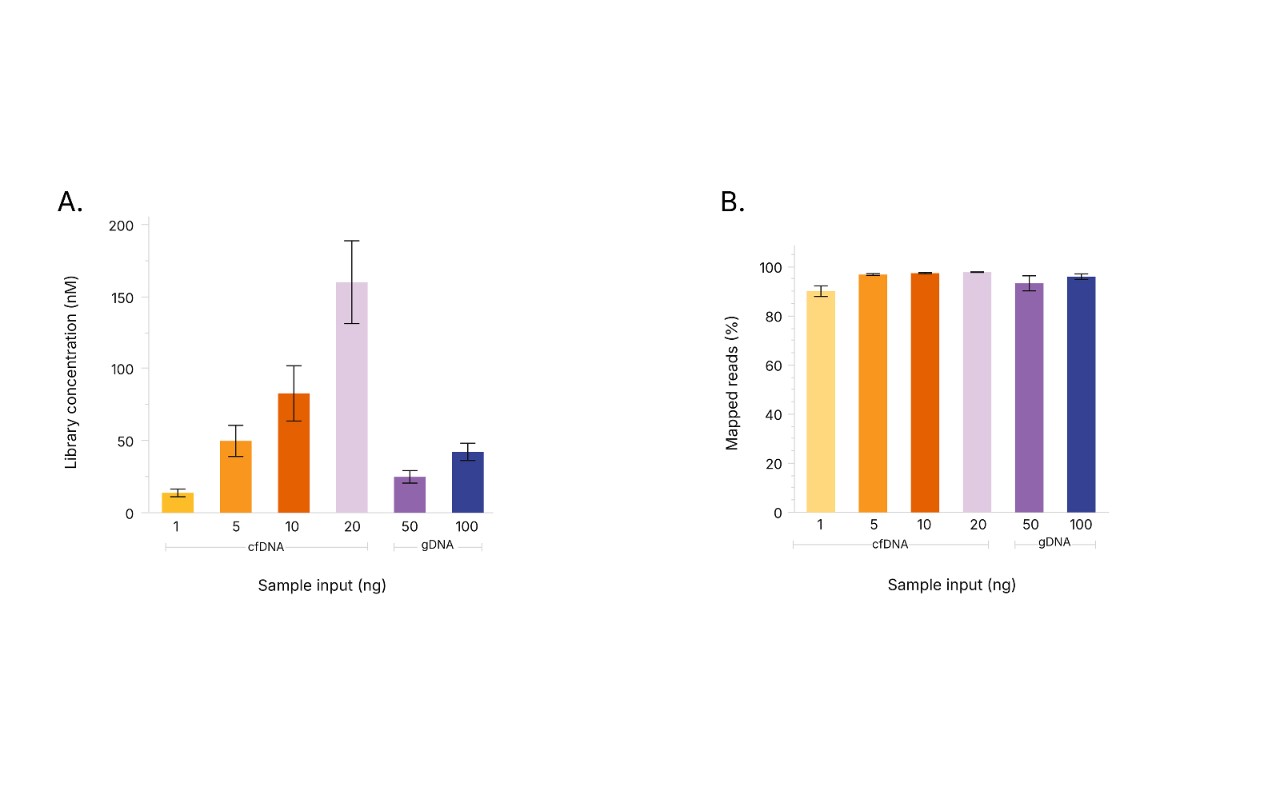 (A) Library yields and (B) alignment rates (percent mapped reads) using Illumina 5-Base DNA Prep for 1–20 ng inputs of cfDNA from healthy donors and 50–100 ng inputs of gDNA from human reference sample NA12878.