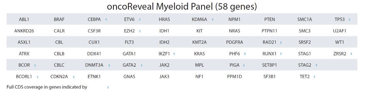 Pillar oncoReveal Myeloid Panel interrogates 58 genes from DNA.
