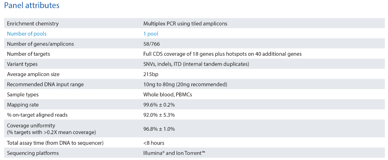 | Description | 58-gene amplicon based DNA panel, simple single tube workflow |